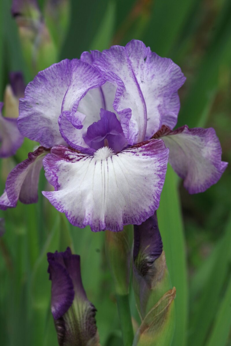 (White) IB 58cm 2025. Midseason bloom. Lavender-blue plicata pattern on snow white. Reblooming