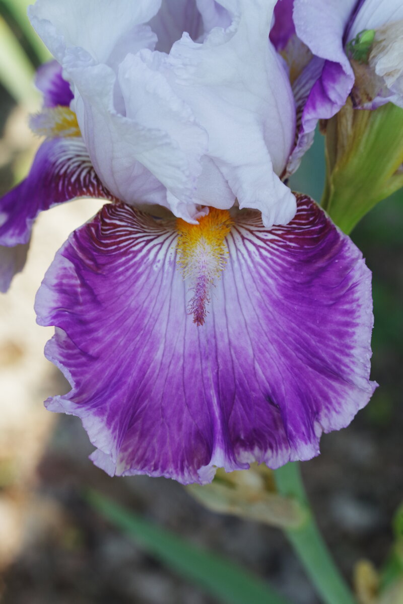 (Bianco) TB 90cm 2025. Fioritura da metà a tarda. Vessilli lavanda chiarissimo, ali bianche con bordo lavanda, barba arancio sfumata in bianco con corno lavanda